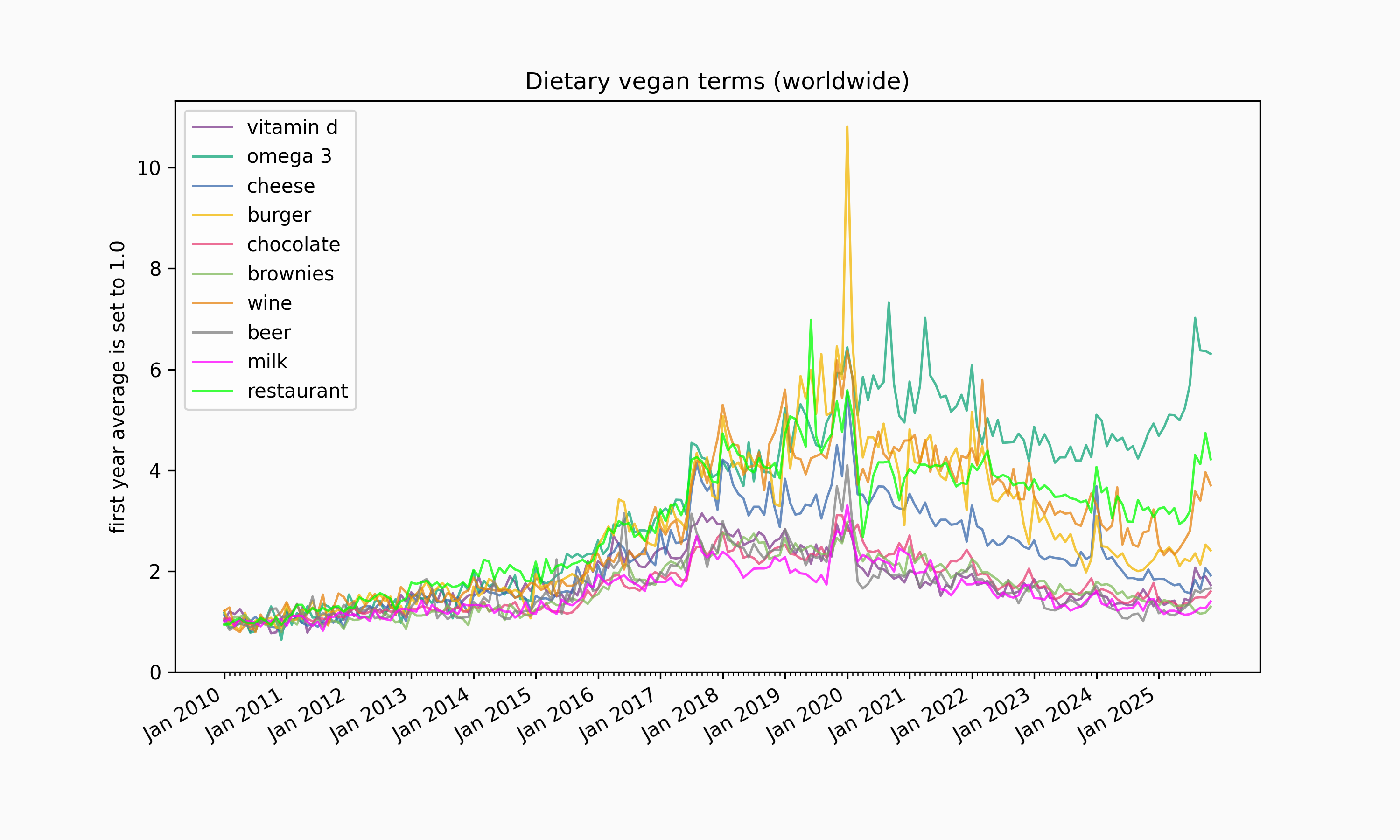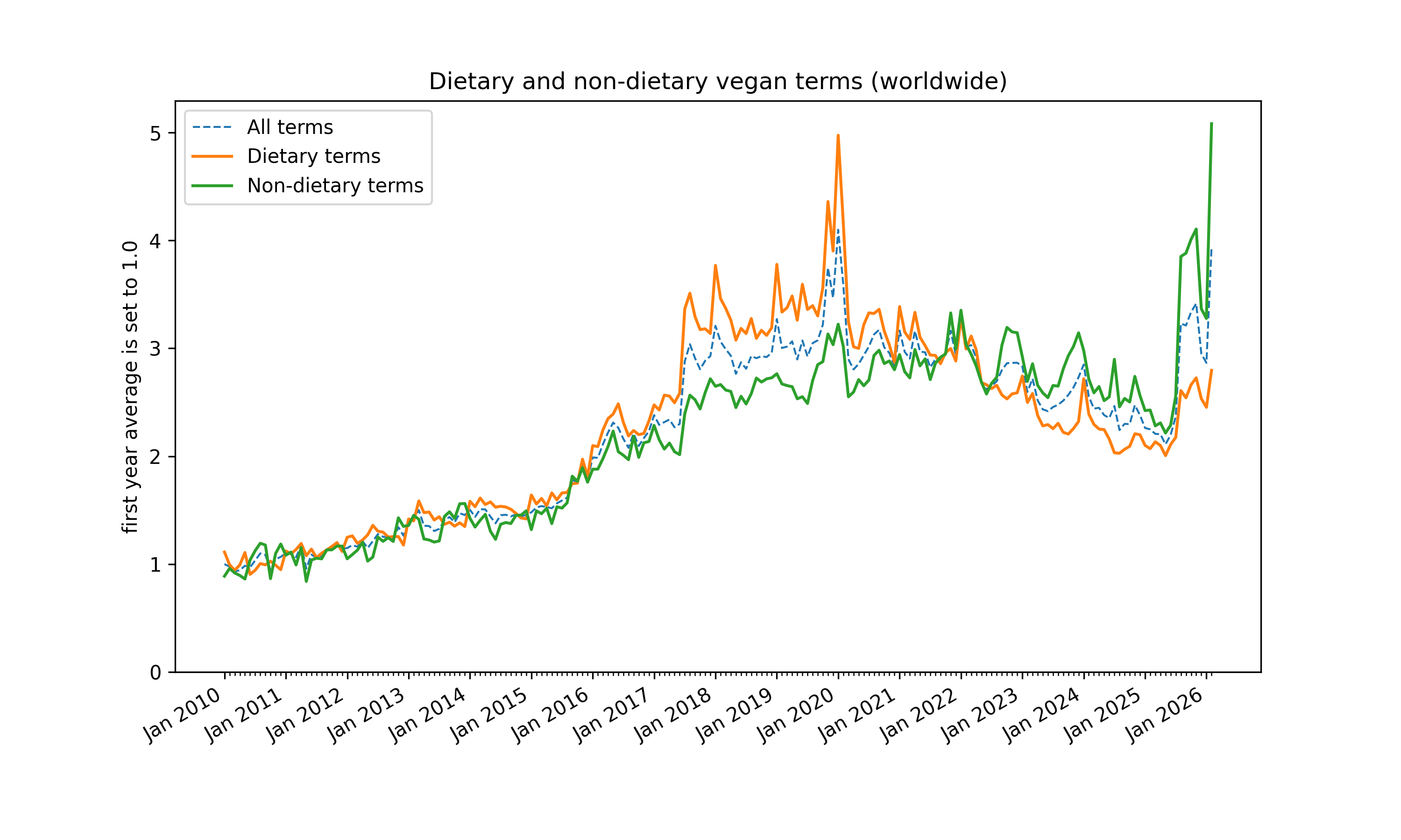 Most terms display the same new peak, with the exception of some dietary ones. A quick investigation did not find a satisfactory explanation of the new peak for worldwide searches. The same increase is not seen in US-only or UK-only data. Note the the UK data is limited, making conclusions on it less reliable. A manual check for the most popular veganised search terms found no other geography available with sufficient sampled data.