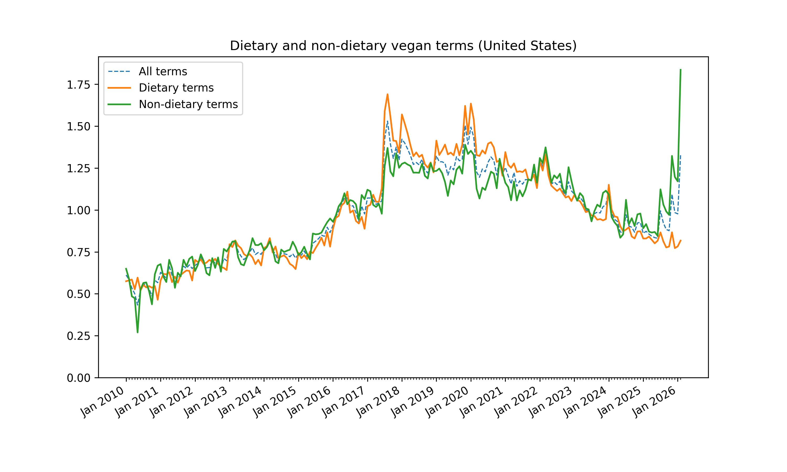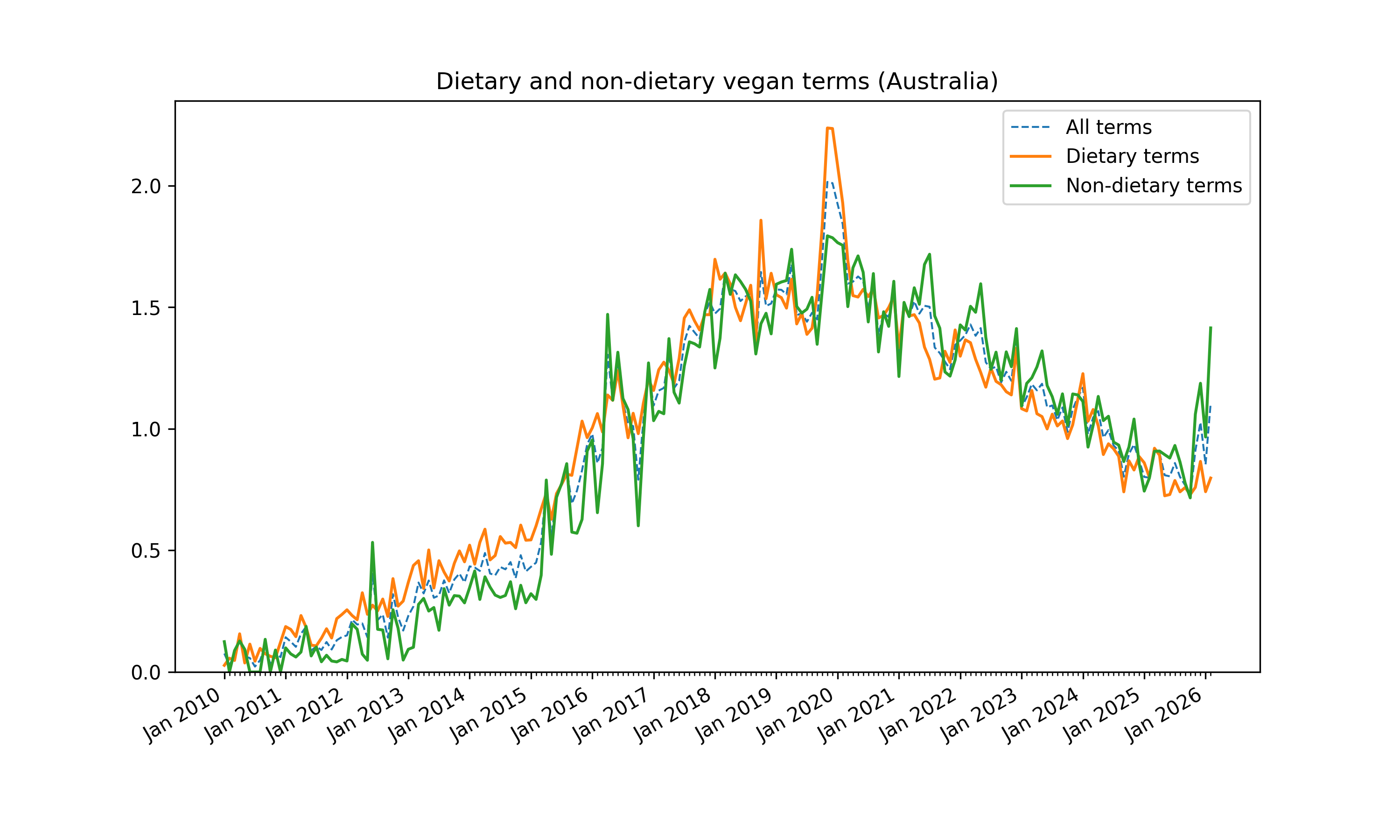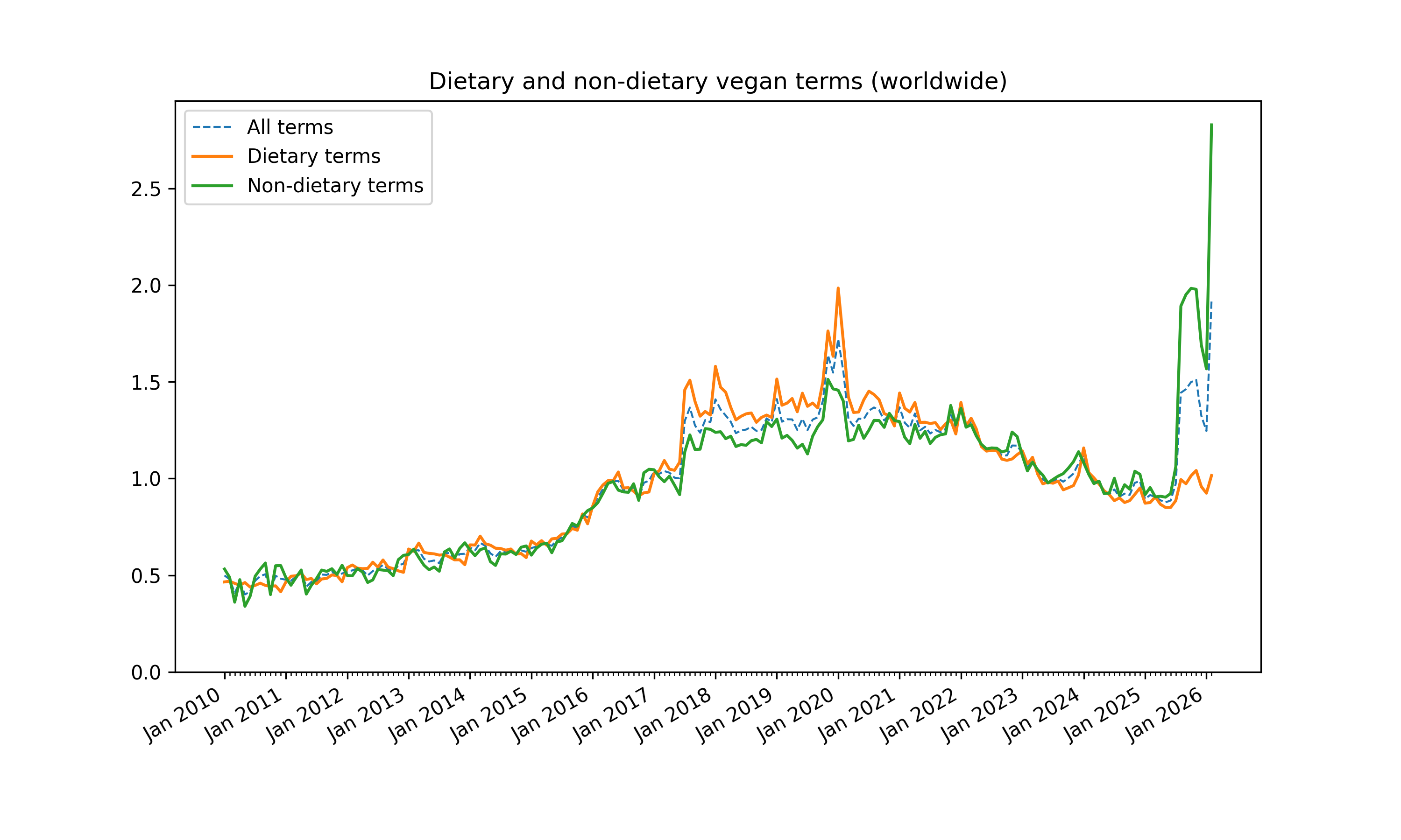The relative popularity of veganism is estimated using Google Trends analysis. For the full method, see the detailed report. Using search terms, dietary searches are separated from non-dietary ones. These trends are a proxy for the interest in and popularity of dietary and ethical veganism.