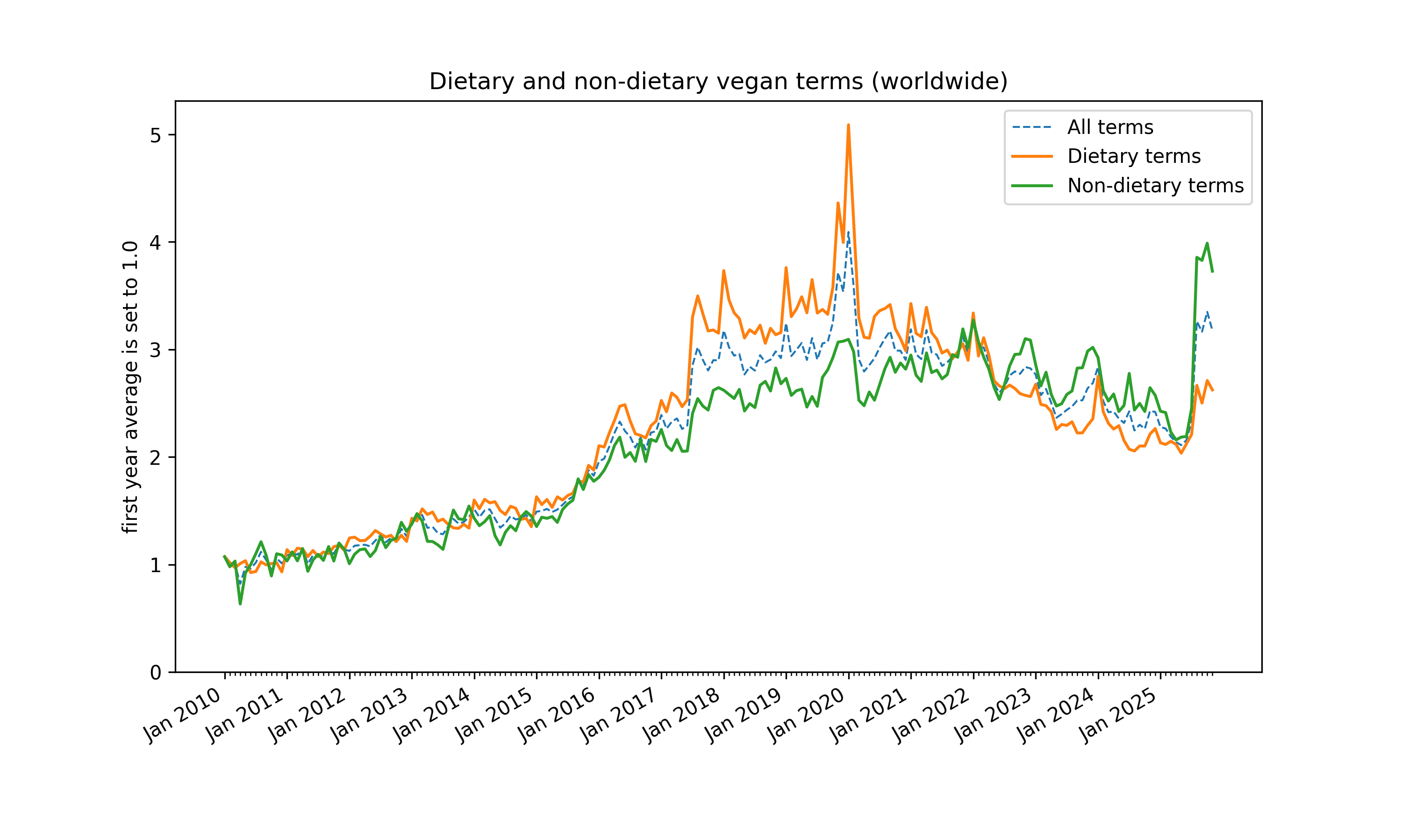 Most terms display the same new peak, with the exception of some dietary ones. A quick investigation did not find a satisfactory explanation of the new peak for worldwide searches. The same increase is not seen in US-only or UK-only data. Note the the UK data is limited, making conclusions on it less reliable. A manual check for the most popular veganised search terms found no other geography available with sufficient sampled data.
