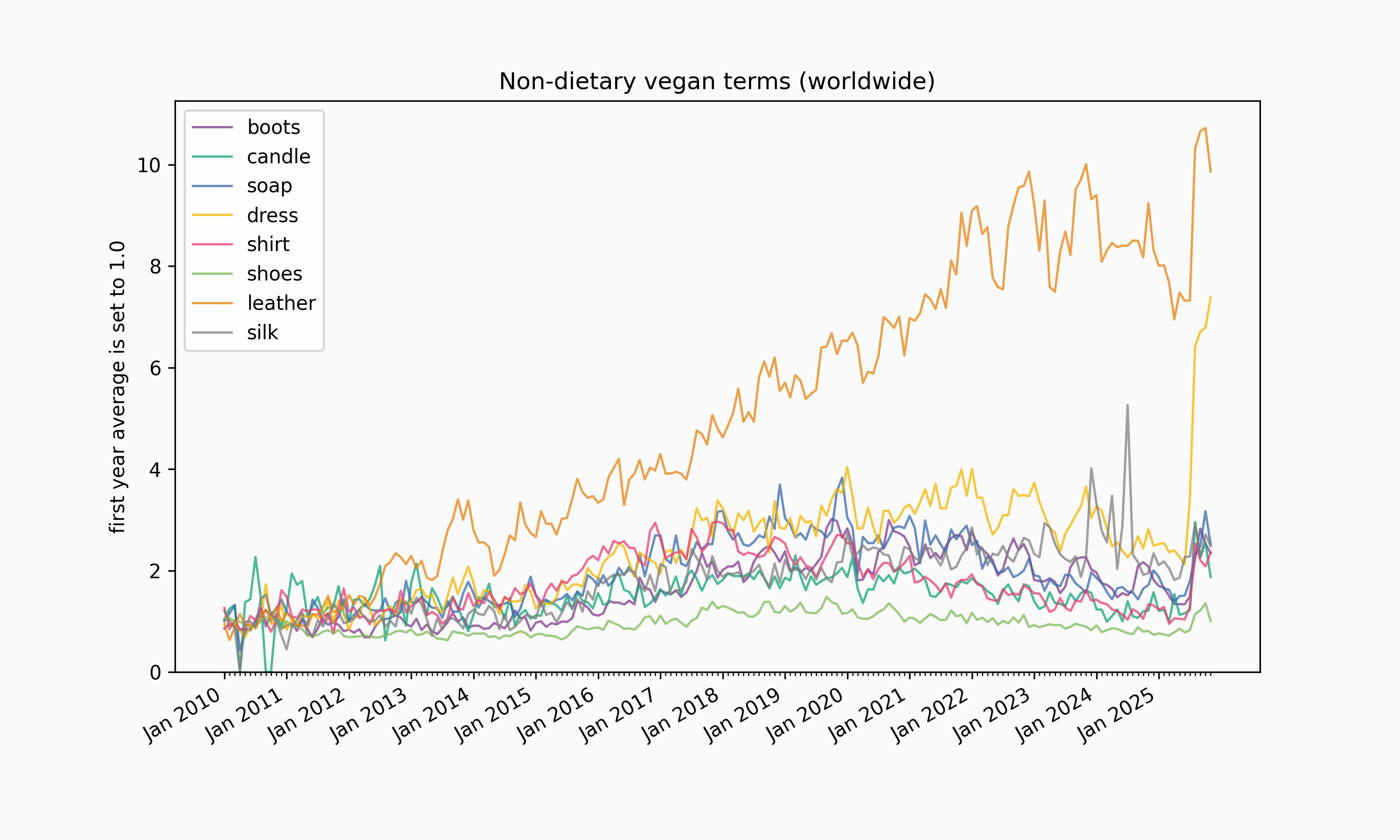 Following up on the previous report (full details are here), the popularity of vegan search terms on Google Trends shows a new increase in August 2025. This increase is most dramatic in non-dietary terms, which all show it to some degree, with "vegan dress" being especially dramatic.