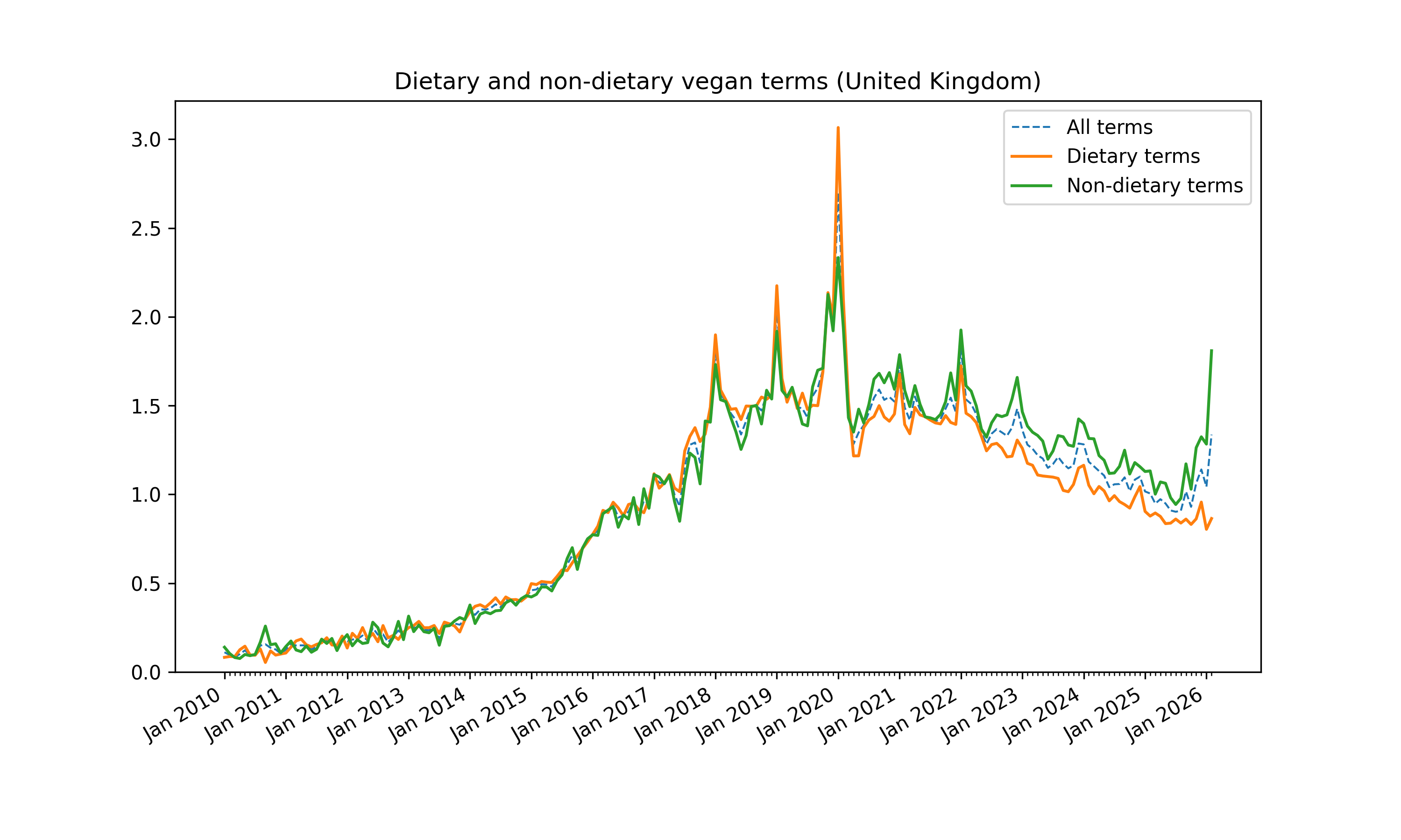 The relative popularity of veganism is estimated using Google Trends analysis. For the full method, see the detailed report. Using search terms, dietary searches are separated from non-dietary ones. These trends are a proxy for the interest in and popularity of dietary and ethical veganism.